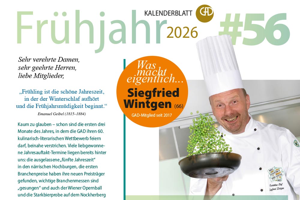 Was macht eigentlich Siegfried Wintgen? Etwas Glück ist immer dabei, wenn es um eine "Bilderbuchkarriere" geht, aber auch Disziplin, Genauigkeit, Teamgeist und das richtige Gespür für die richtigen Entscheidungen bilden die Basis für das, was einen Küchenmeister bis zum Teamkapitän der Nationalmannschaft der Köche bringt. Details gibt es im frühlingshaften Kalenderblatt...